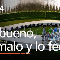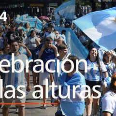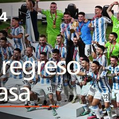 | Los campeones del mundo de fútbol, con Leonel Messi a la cabeza, celebran con los aficionados argentinos... |