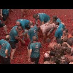 | Buñol (España), 30 ago (EFE).- El rojo de 150.000 kilos de tomates de variedad pera bien maduros colorearon... |